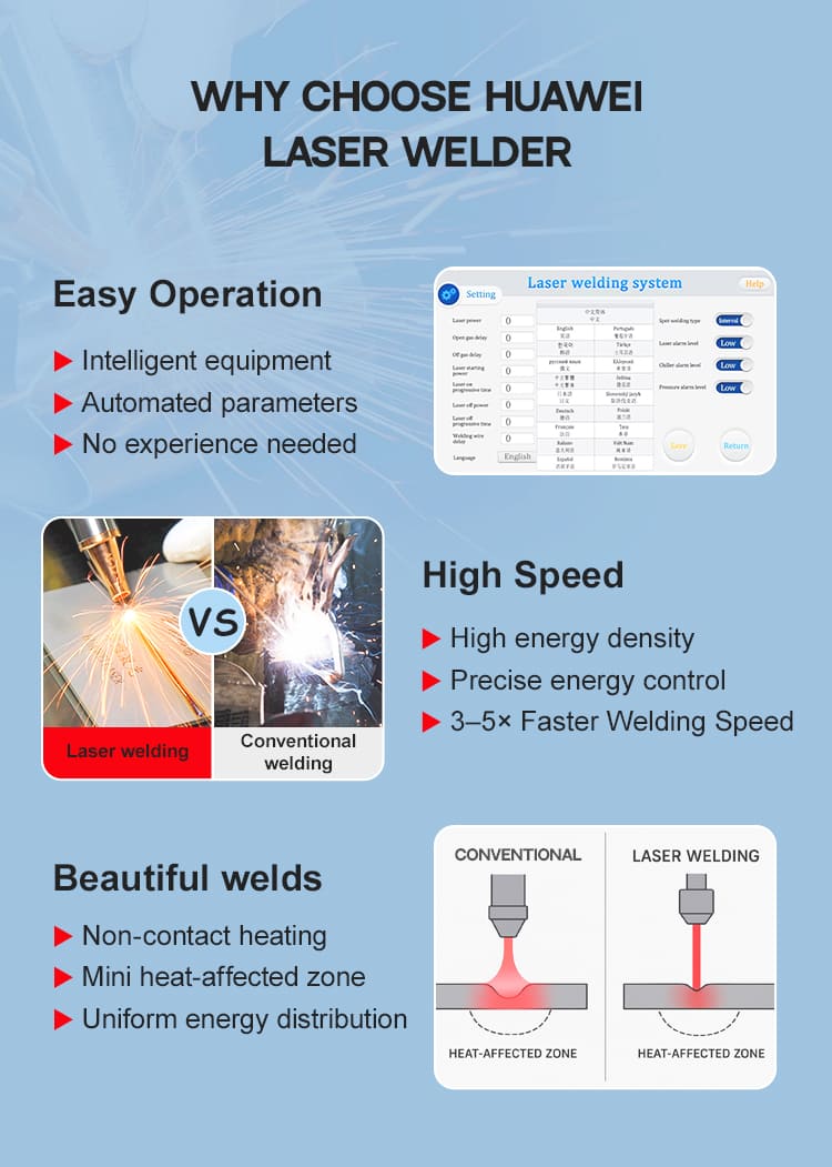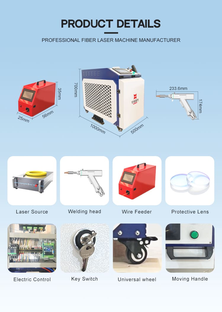 4. संचालित करने और सीखने में आसान: हैंडहेल्ड लेजर वेल्डिंग ऑपरेशन सरल और सीखने में आसान है, श्रम लागत बचाता है और तेजी से प्रशिक्षण और प्रेरण के लिए उपयुक्त है।