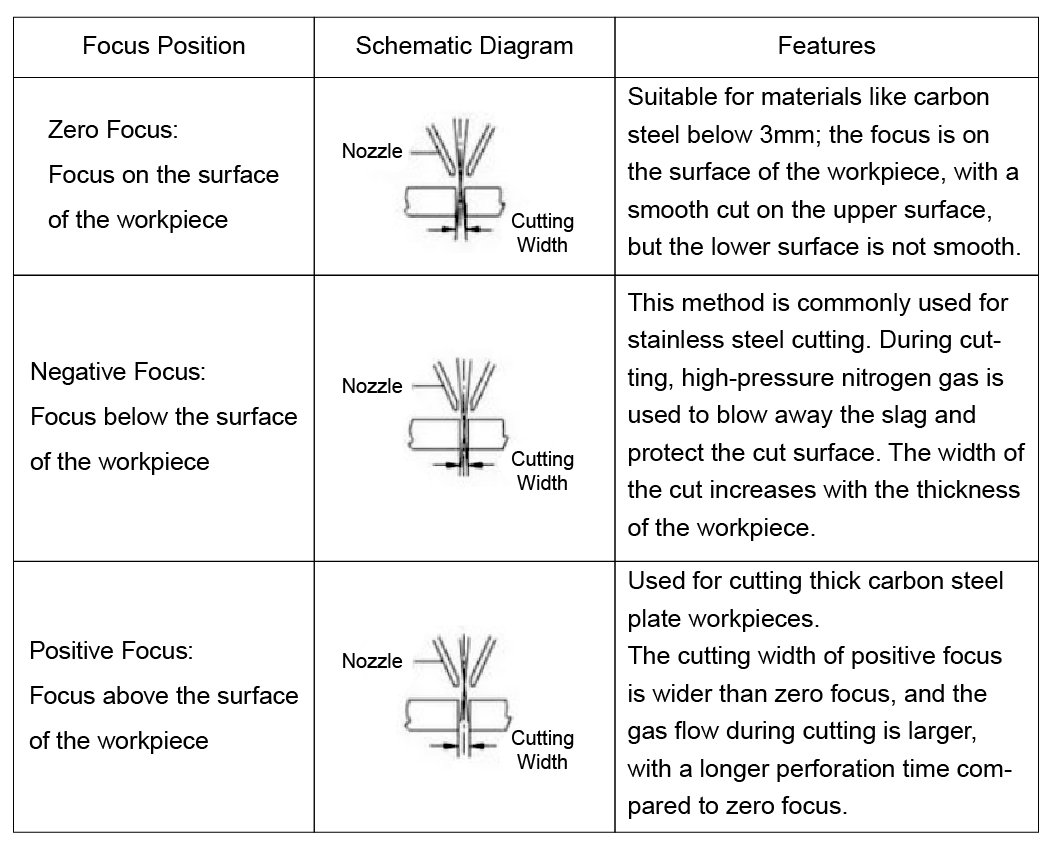 पतली प्लेट काटने:पतली प्लेटों को काटते समय, शून्य फोकस और मामूली सकारात्मक फोकस दोनों का उपयोग किया जा सकता है। शून्य फोकस बेहतर परिशुद्धता और सतह की गुणवत्ता प्रदान करता है, जबकि सकारात्मक फोकस उपयुक्त है जब ऊर्ध्वाधरता एक महत्वपूर्ण आवश्यकता है। यह सुनिश्चित करता है कि कट नीचे की तुलना में शीर्ष पर थोड़ा व्यापक है, स्लैग हटाने और ऊर्ध्वाधरता को बनाए रखने की सुविधा प्रदान करता है।